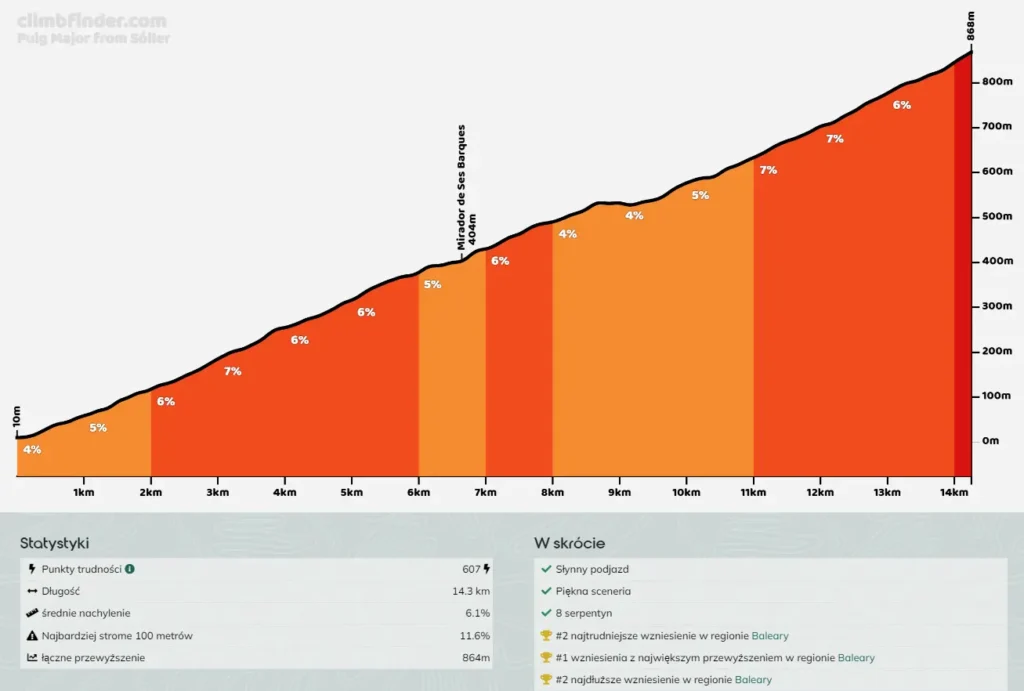 Podjazd na Puig Major rozpoczyna się w malowniczym miasteczku Sóller, znanym z wąskotorowej kolejki, która łączy je z Palmą, oraz przepysznych pomarańczy, uprawianych tu od pokoleń. Droga wznosi się przez ponad 14 km, osiągając wysokość 850 m n.p.m., a nachylenie trasy wynosi przeciętnie 6%. To sprawia, że jest to podjazd wymagający, ale zarazem dostępny dla ambitnych amatorów. Na trasie nie brakuje serpentyn i długich prostych odcinków, które pozwalają na chwilę wytchnienia i podziwianie otaczającej przyrody.